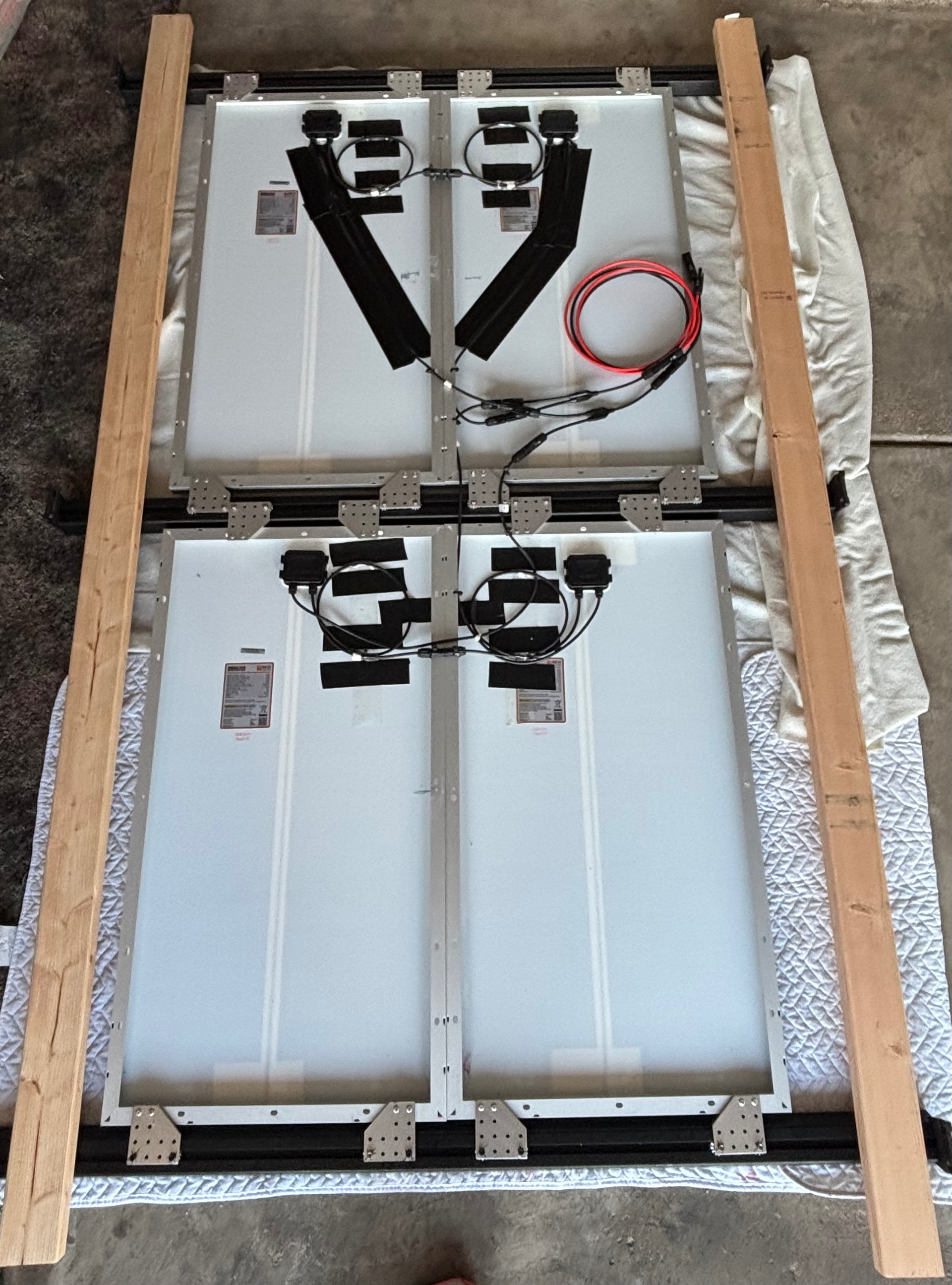 This is my array. Wires are secured with 3M VHB as well as Gorilla Tape and zip ties. Locked down pretty tight. Configured in series-parallel . Gonna try to mount it this weekend. Will show final install at that time.