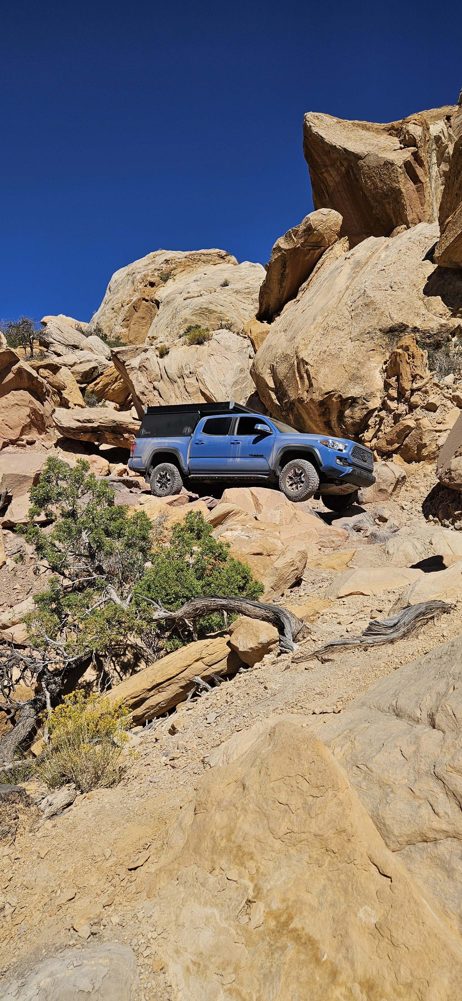 Initially a stock rig, but with the add of a ~265 lbs continuous load a bit of suspension work was desired. At work the fundamental question usually revolves around “what is the intended use case”. My interest is camping, the truck gets me to those places. The wheelin’ aspect isn’t my focus. Being from AZ, a requirement to avoid sun exposure was to “still fit in the garage”.