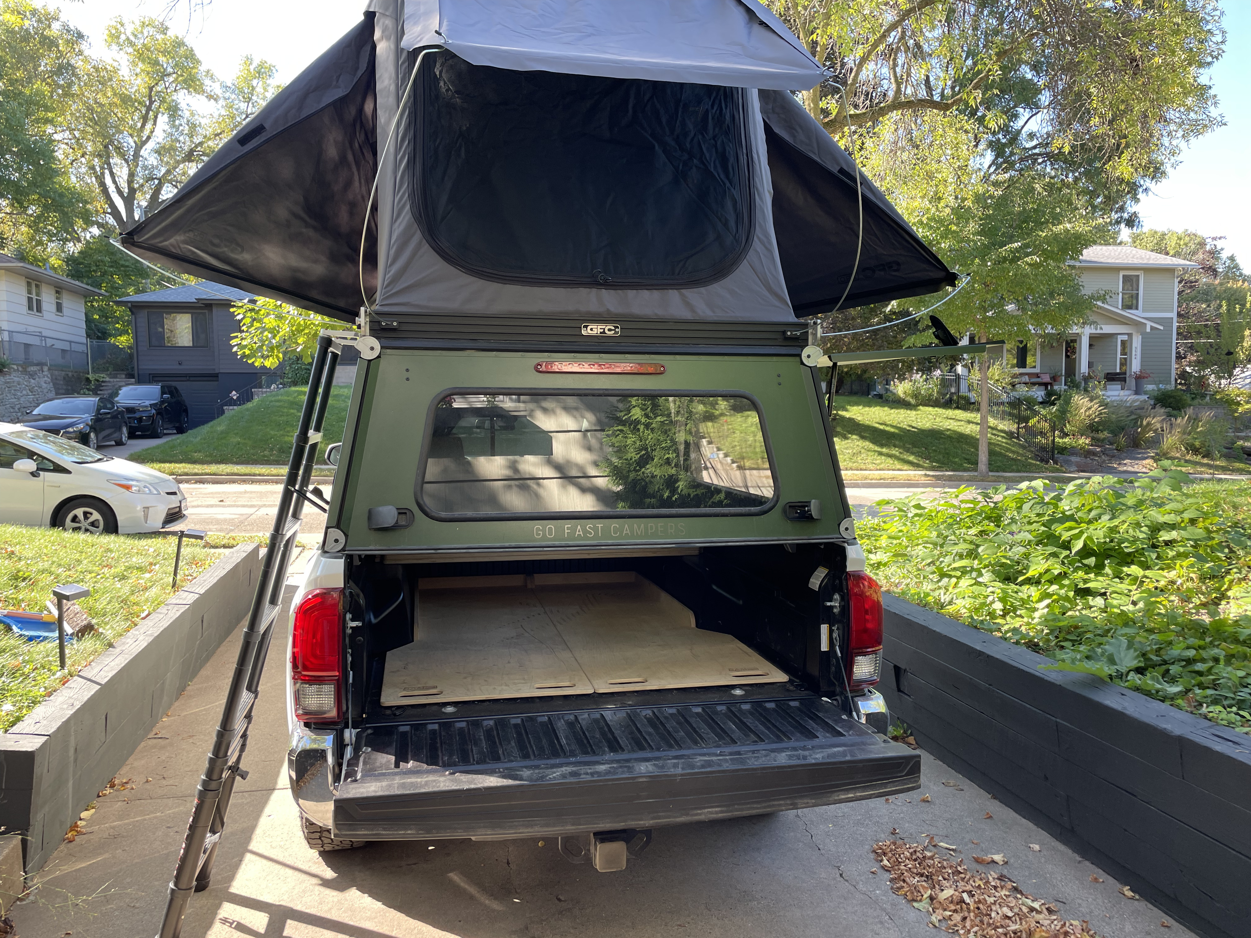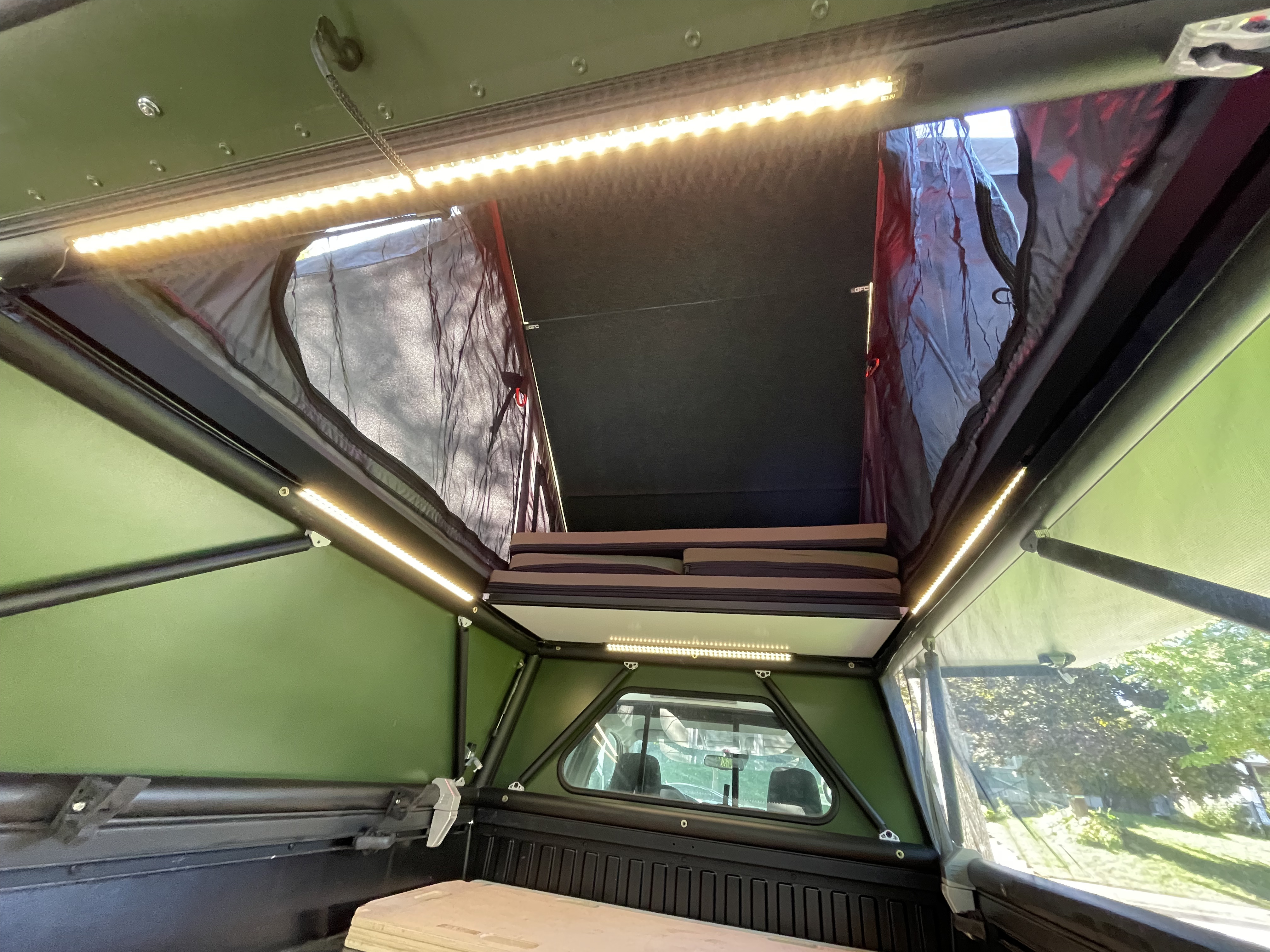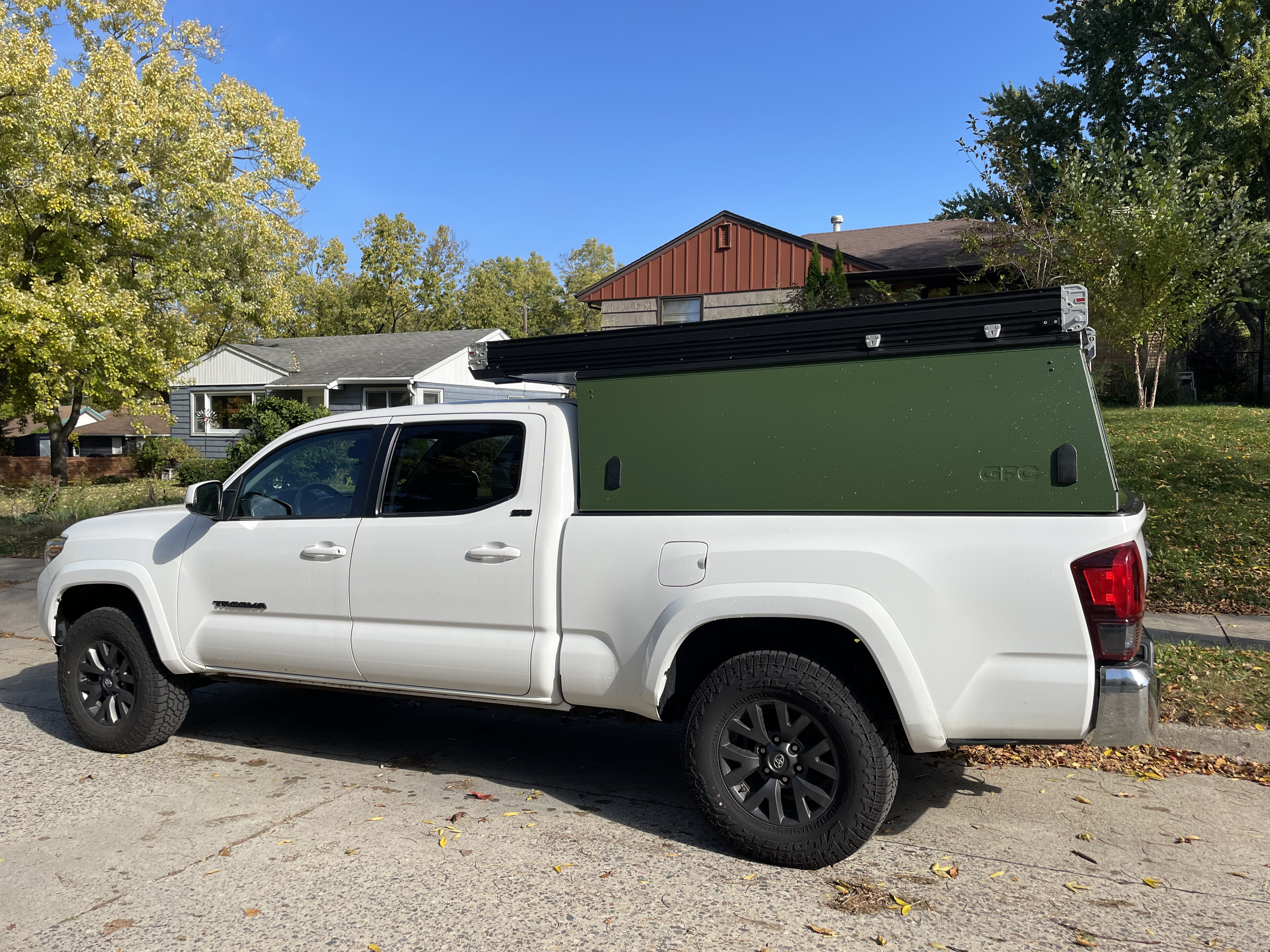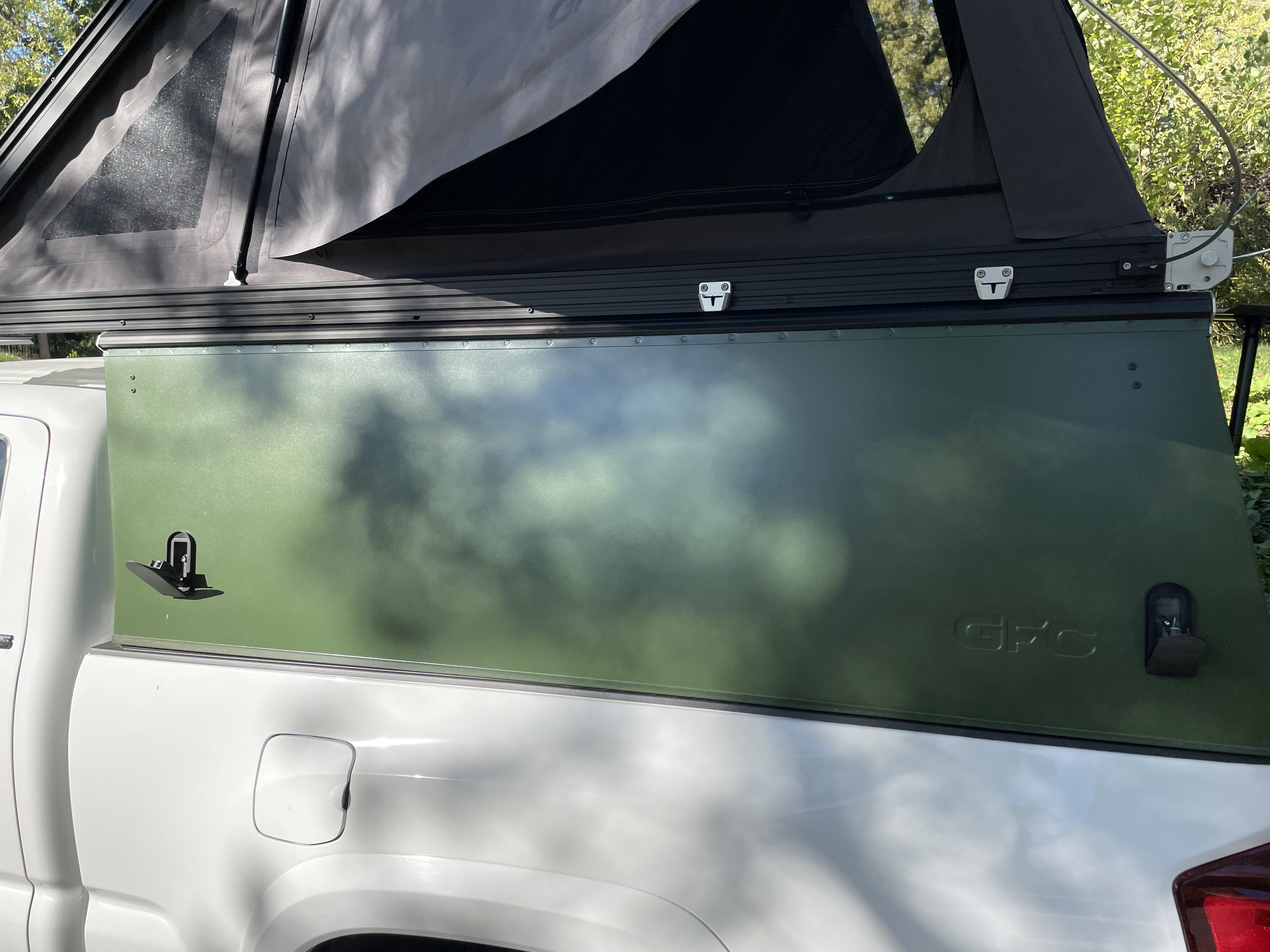 GFC: green panels, front & rear windows, stone grey tent color, double side tent doors, ladder kit with Mantis Claws, second ladder catch kit so the ladder can easily work on either side of the truck, rain fly tent poles and mounting points.