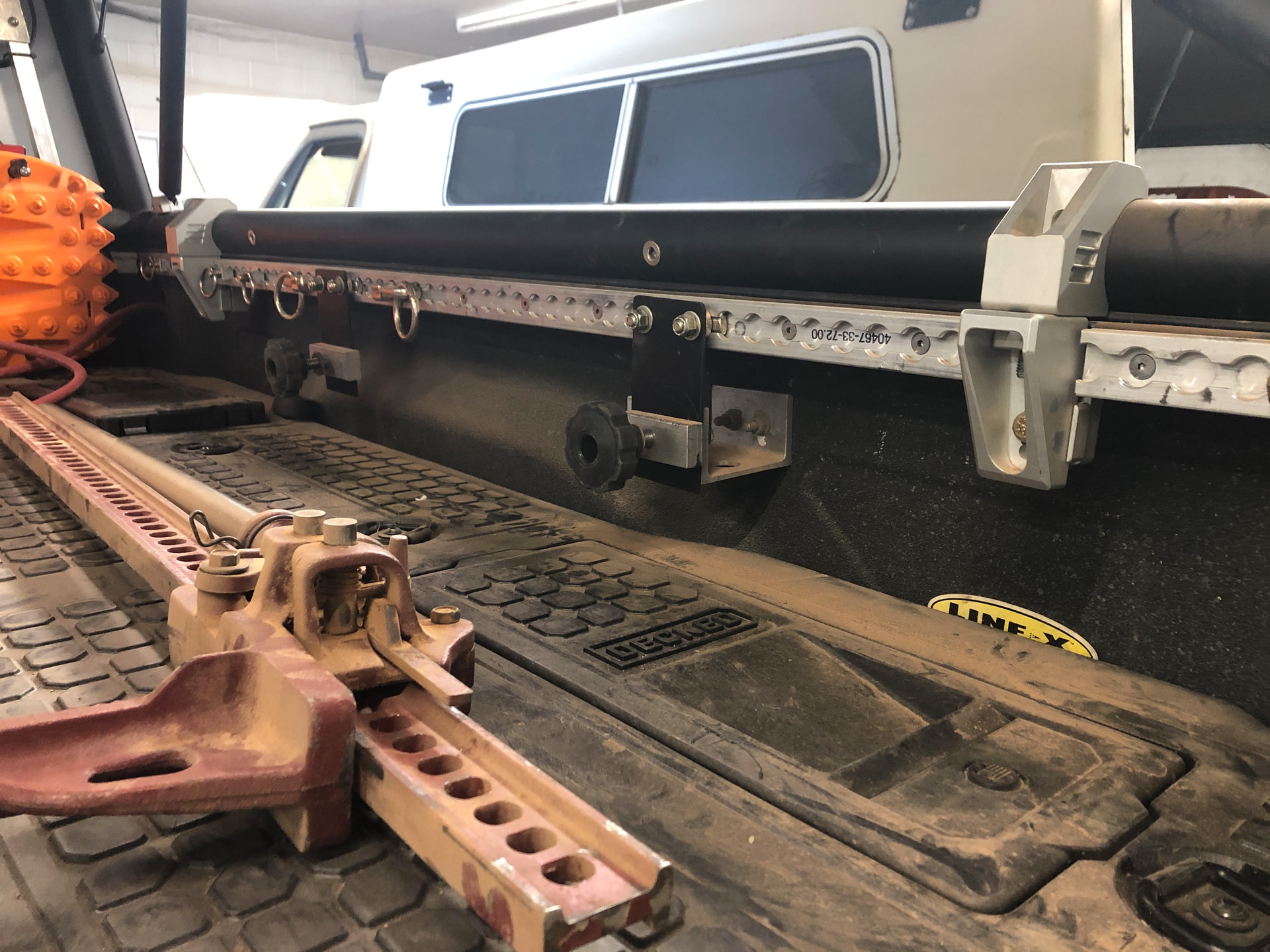 On my full size Dodge PU I have both the OEM jack mounted under the passenger seat and a Hi-Lift mounted to the bed rail. I added L-track all the way around the bed and made brackets to hang the Hi-Lift from the the L-Track. It’s tucked in and doesn’t get in the way too much and is still accessible on the rare occasion I need it. The Hi-Lift jack base I have is from Slagfactory.com and it is stored in one of the Decked bins.