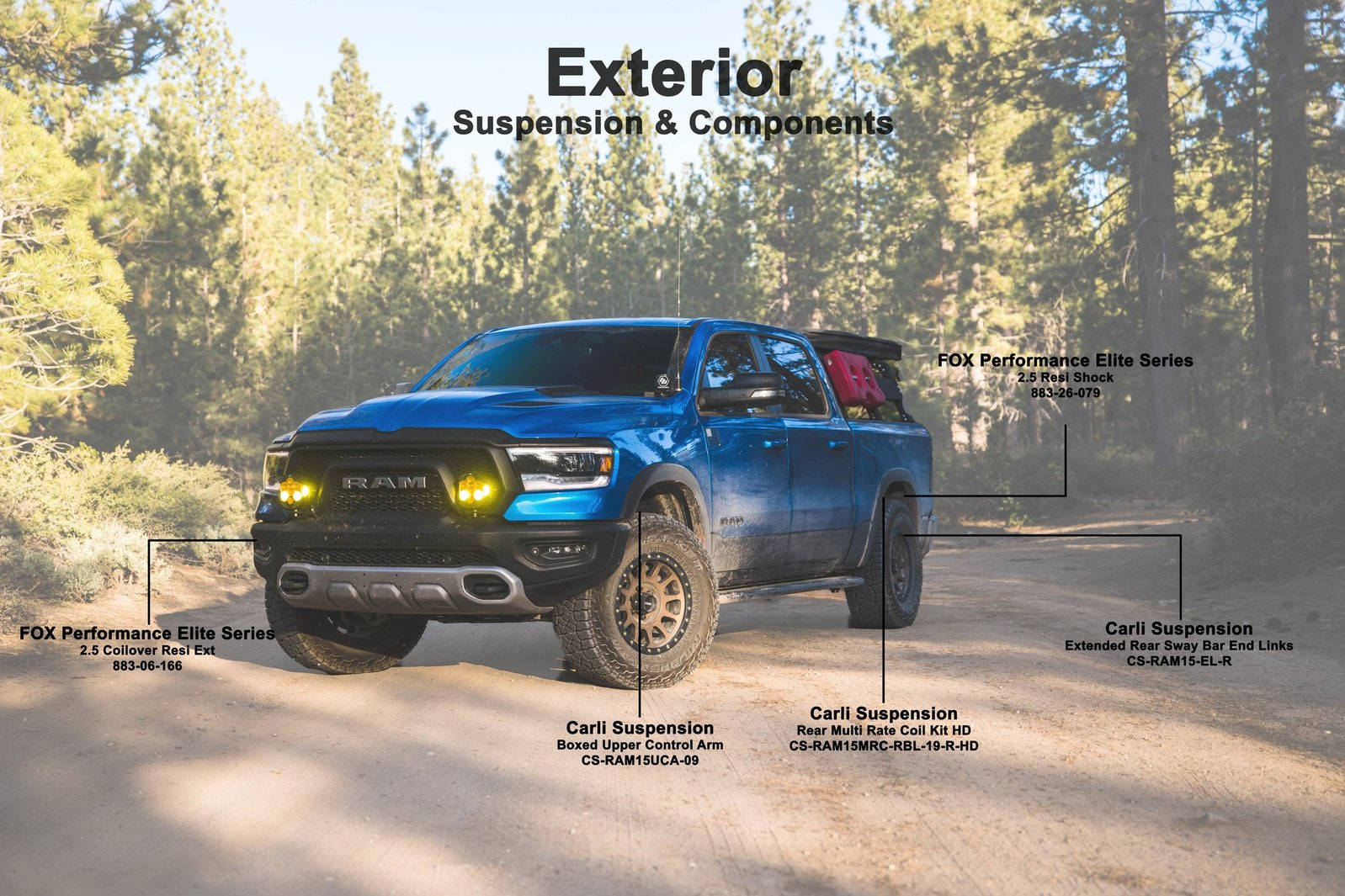 Bilstein 5100s set at clip 4 in the front, bilstein 5100 shock in the rear, Carli Rebel HD rear springs should set you at 2" over stock in the front and level with weight.