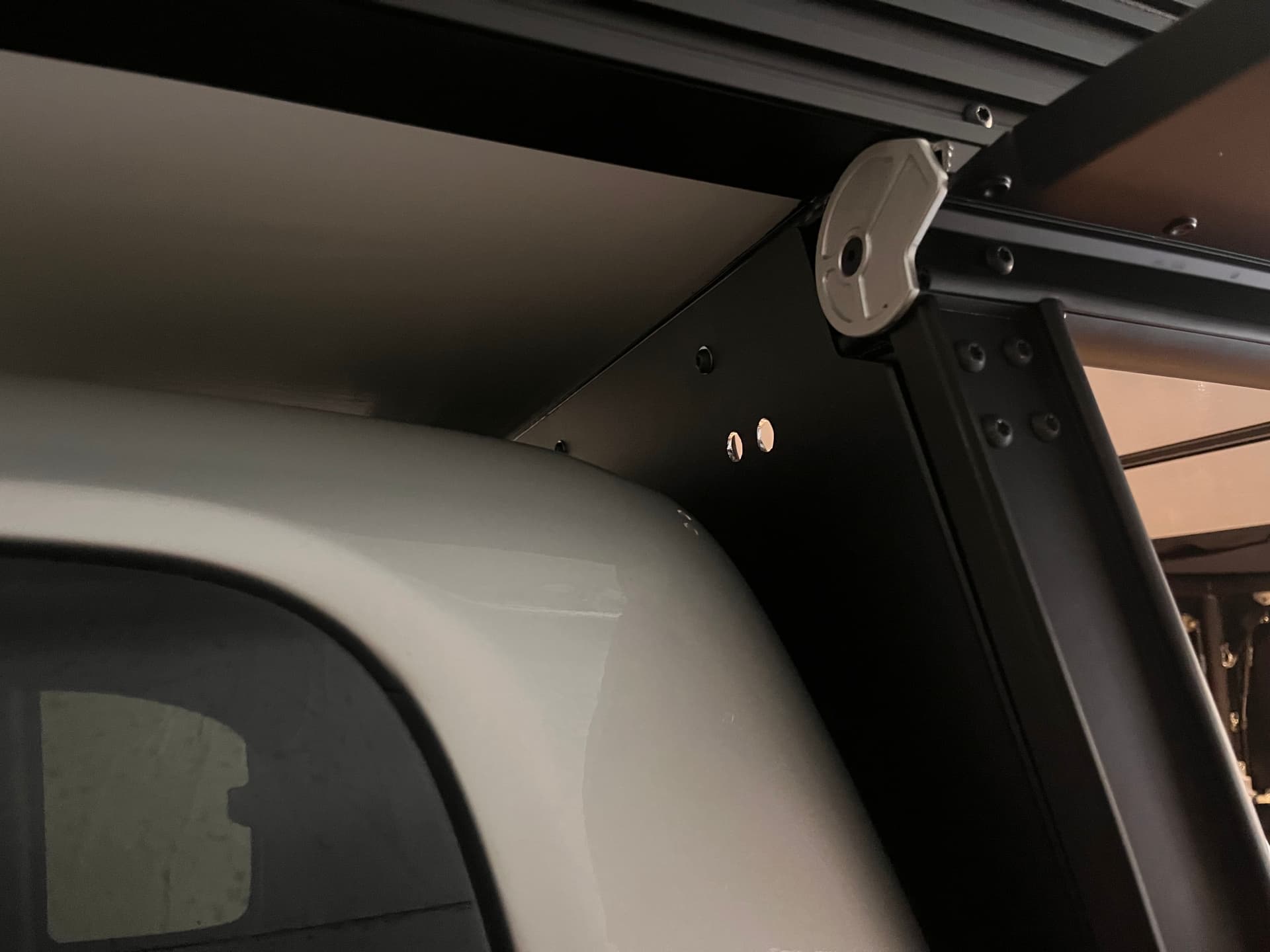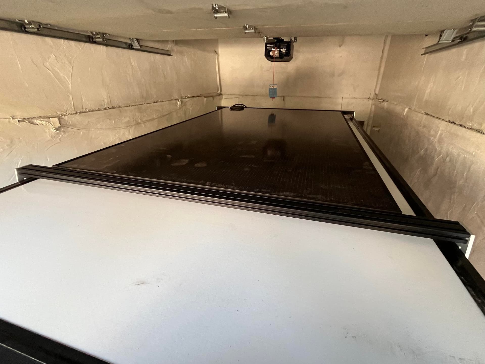With the GFC installed I took a break from the interior and focused on installing a 425W solar panel I picked up in Sacramento the same day I picked up the GFC. I first drilled two holes into the camper for wire pass through and then followed this post to create a DIY roof rack that would hold the panel and attach to the GFC.