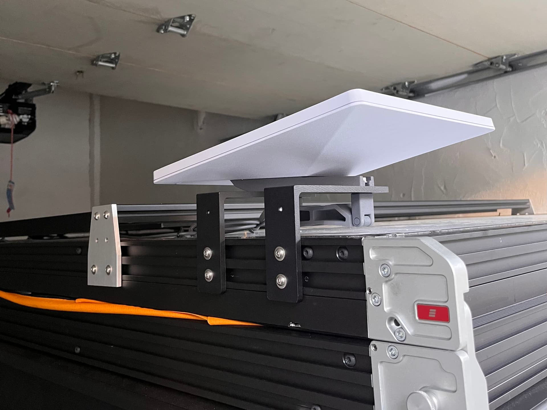 I wanted Starlink to be permanently mounted to my roof so that it could be used in motion. I had intended to mount the dish to the roof rack but after mounting the solar panel, I was afraid the dish would partially shade the panel. So instead, I found some L brackets on Amazon that I was able to attach to the GFC and then mount the dish onto. It’s not my favorite setup but it’s good enough for now.