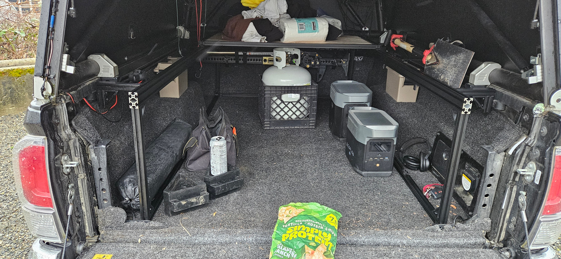 - Prioritize utility/cargo space over comfortable living space. So, no dedicated couch/table in the truck bed, but still able to have makeshift seating/working surface if I end up having to live in the camper instead of out of the camper.