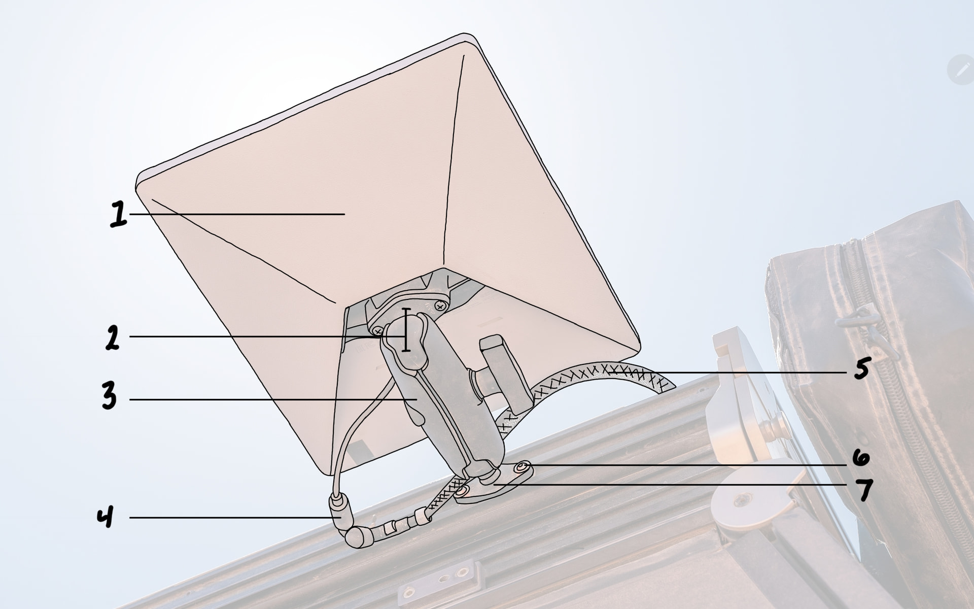 - Ram 1.5” Ball This is mounted to the extrusions using the hardware listed above. Whenever we want to remove the Starlink, this, the cable, and a small cable anchor are all that are left in place.