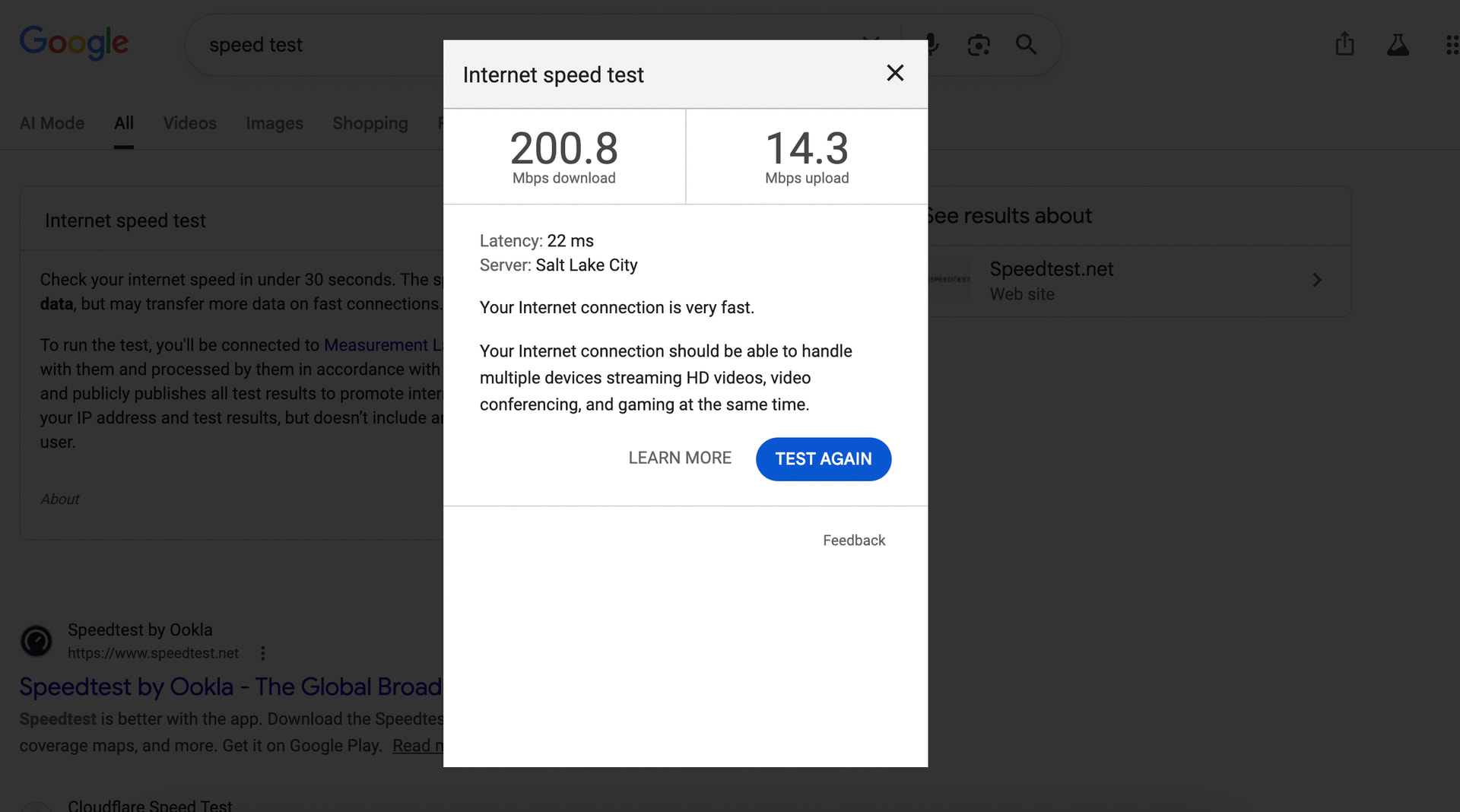 Below are some screenshots of a speed test that I just conducted while at camp, as well as showing how the alignment is off, which doesn’t seem to affect the speed much. Overal the speed has been more than fast enough to allow us both to stream video calls, upload massive photo files, and listen to music all at the same time, it’s truly impressed us!