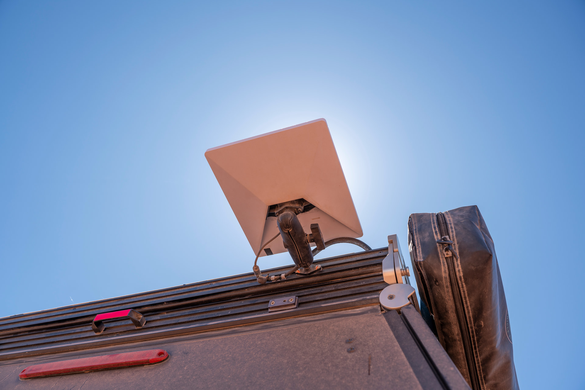 Some things that we considered with this. We really still would like a much lower-profile mounting option than this. However, our solar panels and the headliner in the camper have prevented us from either mounting the dish inside under the roof material or on any portion of the roof on the exterior.