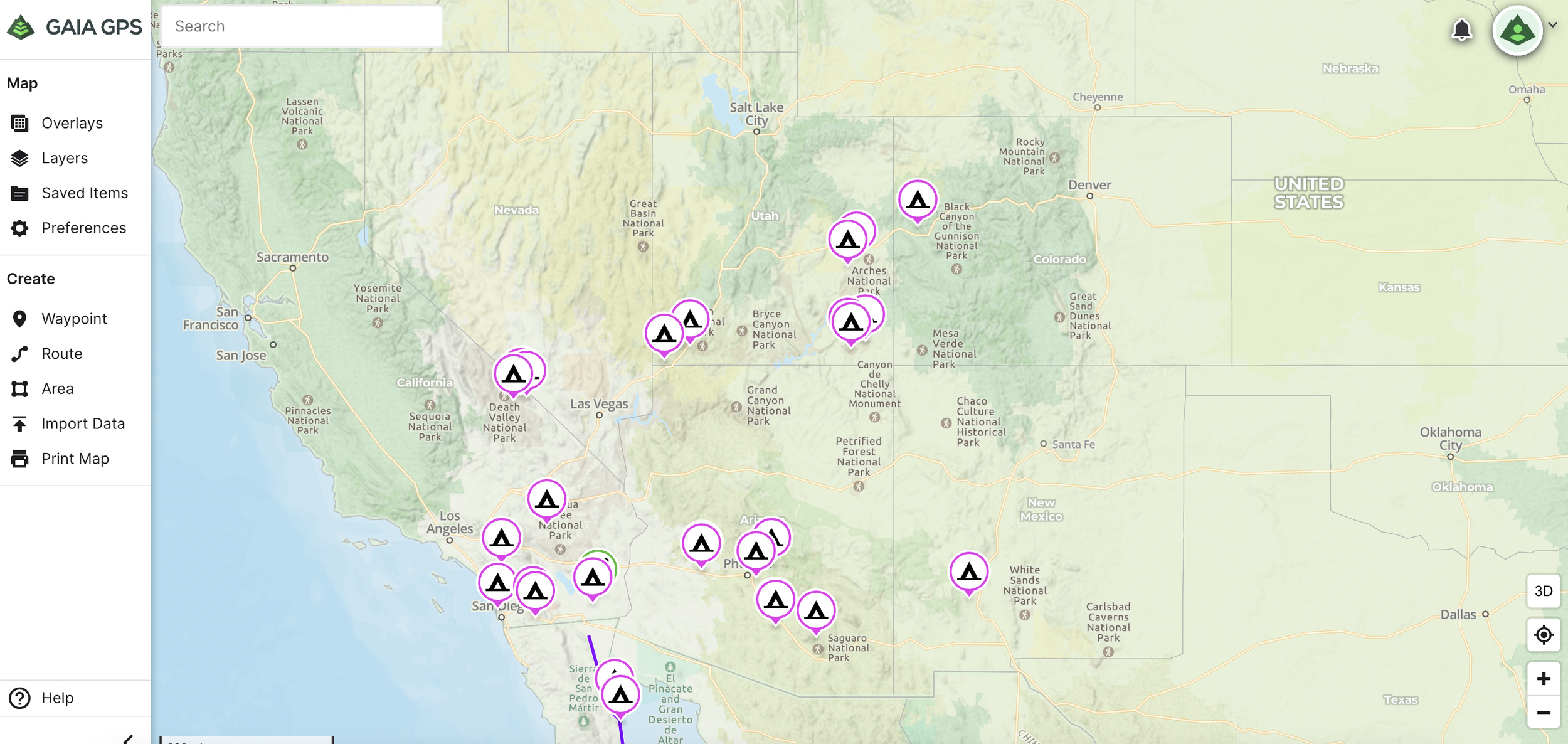 The primary thing that we use this map tool for is navigation, specifically while on trails. After we have gone through the process of finding out where we want to camp for a few days, or several spots that we want to visit we will add them to our Gaia map. Then after they are all added and marked we will make the route to those locations. Once all of that is completed we will download the map along the route for offline use while we are away from cell signal or in between uses of Starlink. Some incredibly helpful information on how to use Gaia can be found here.