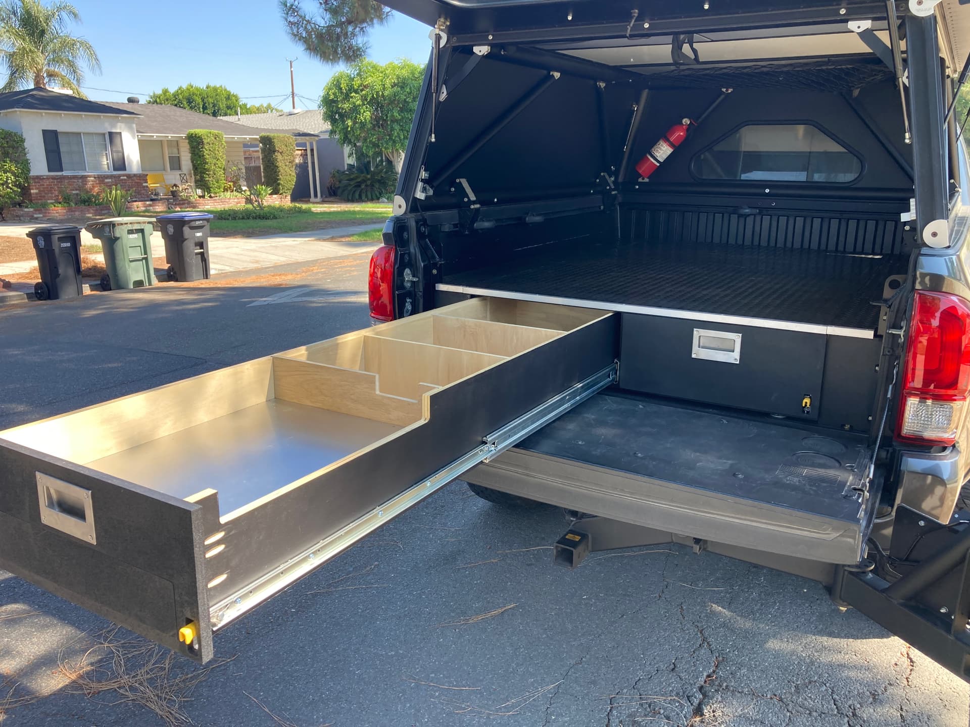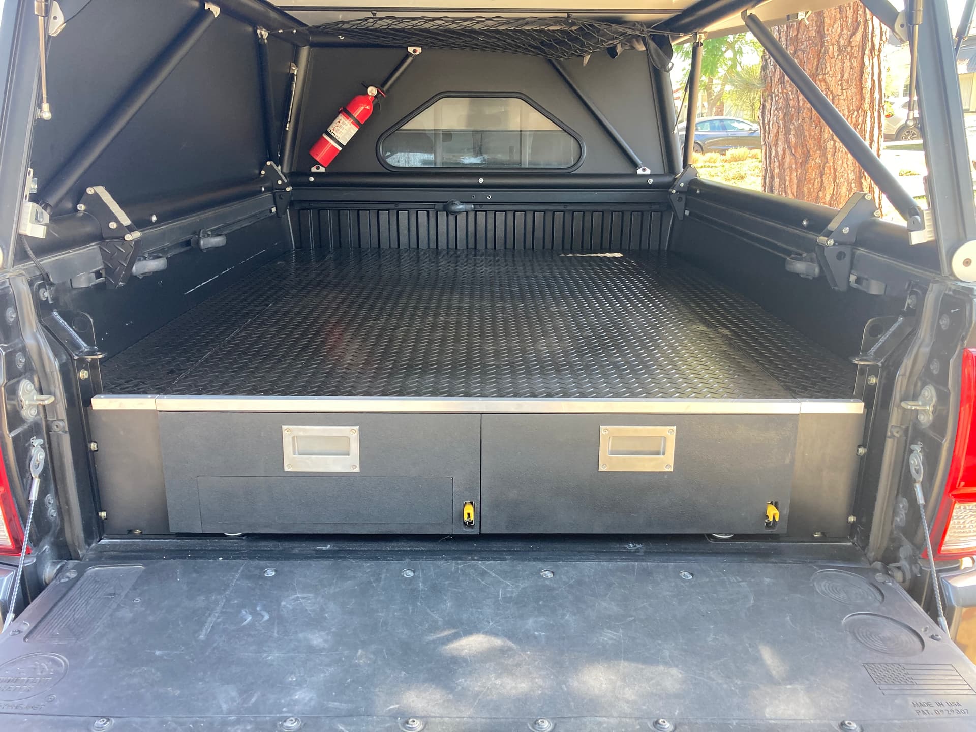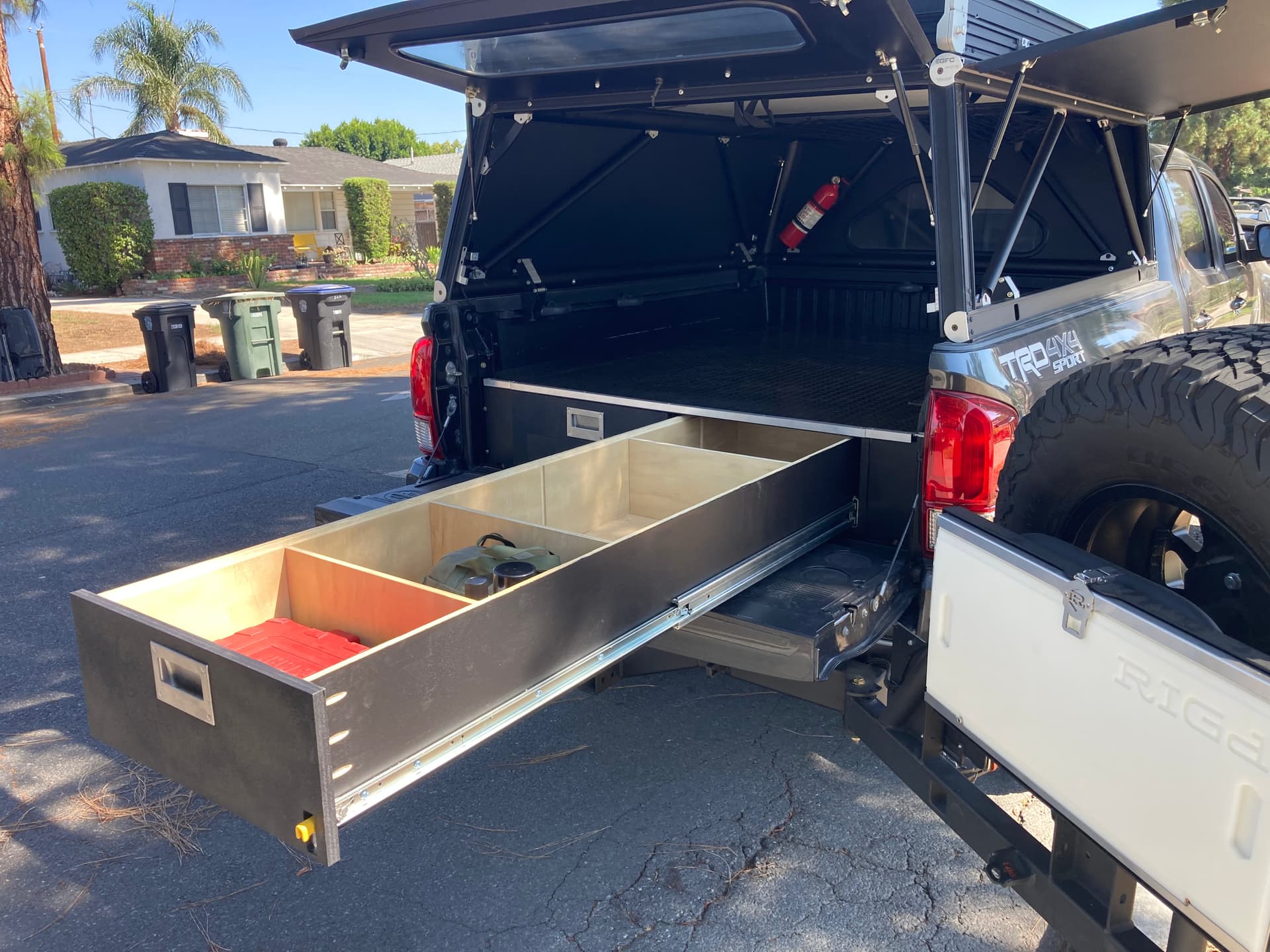 I’ve gone through a couple of different setups but have found that a platform and drawer system is the optimal use of space. This is my current set up that I built. Left drawer used for cooking/pantry/utensils & right drawer used for camp gear/tools. Cubbies in front and rear of wheel wells allow for storage as well.