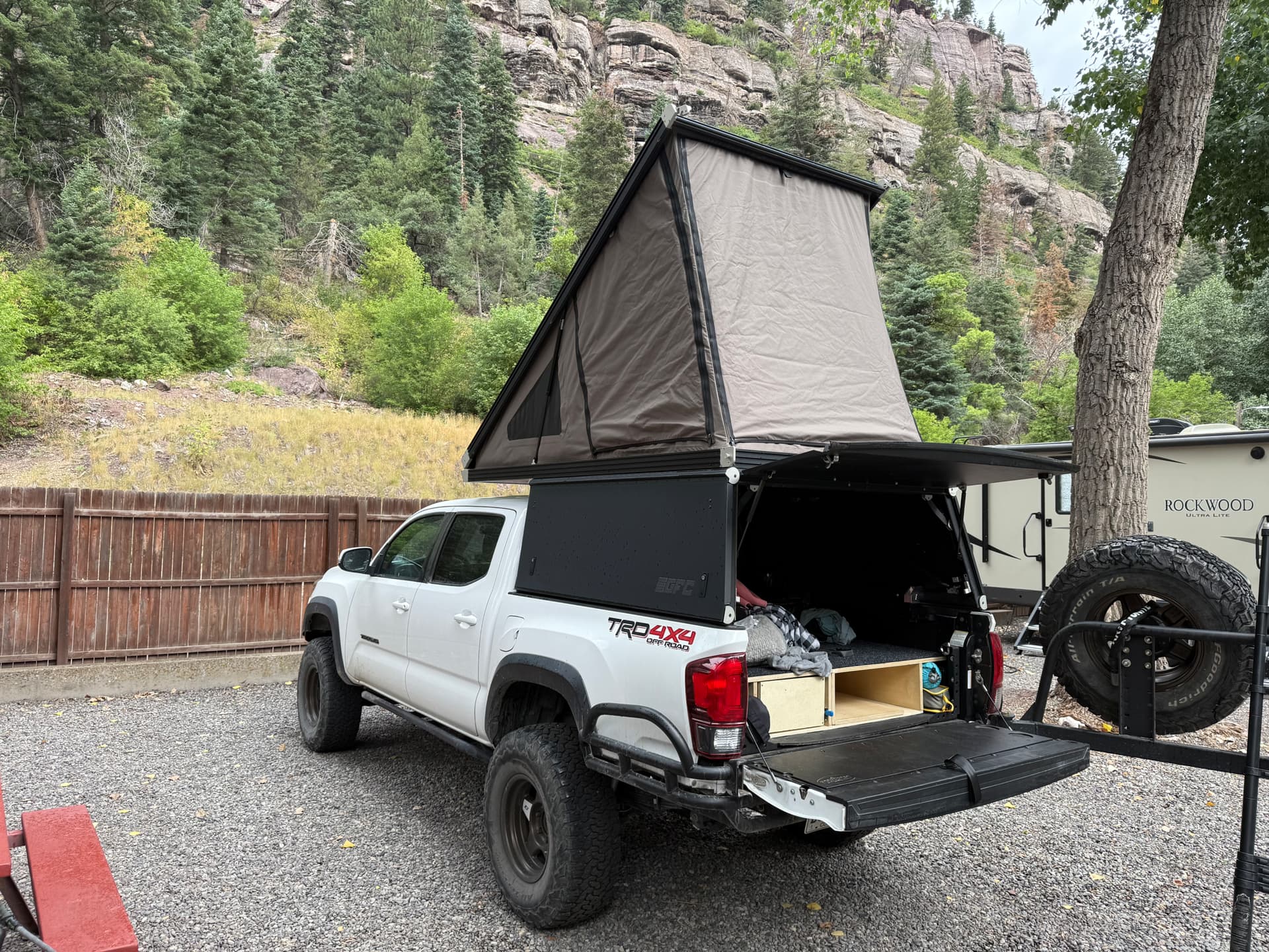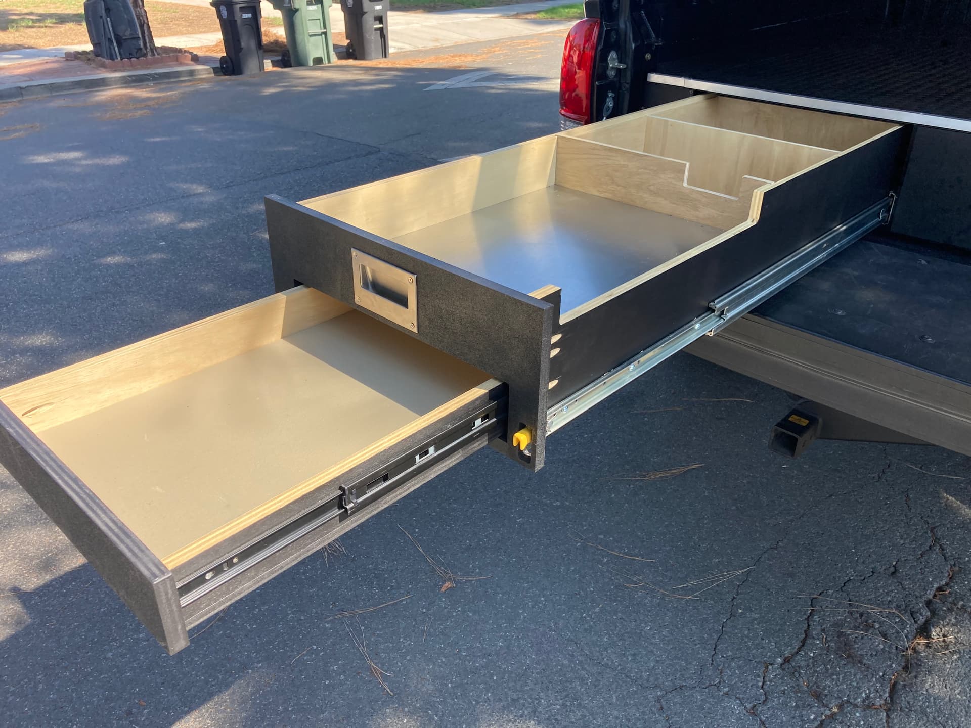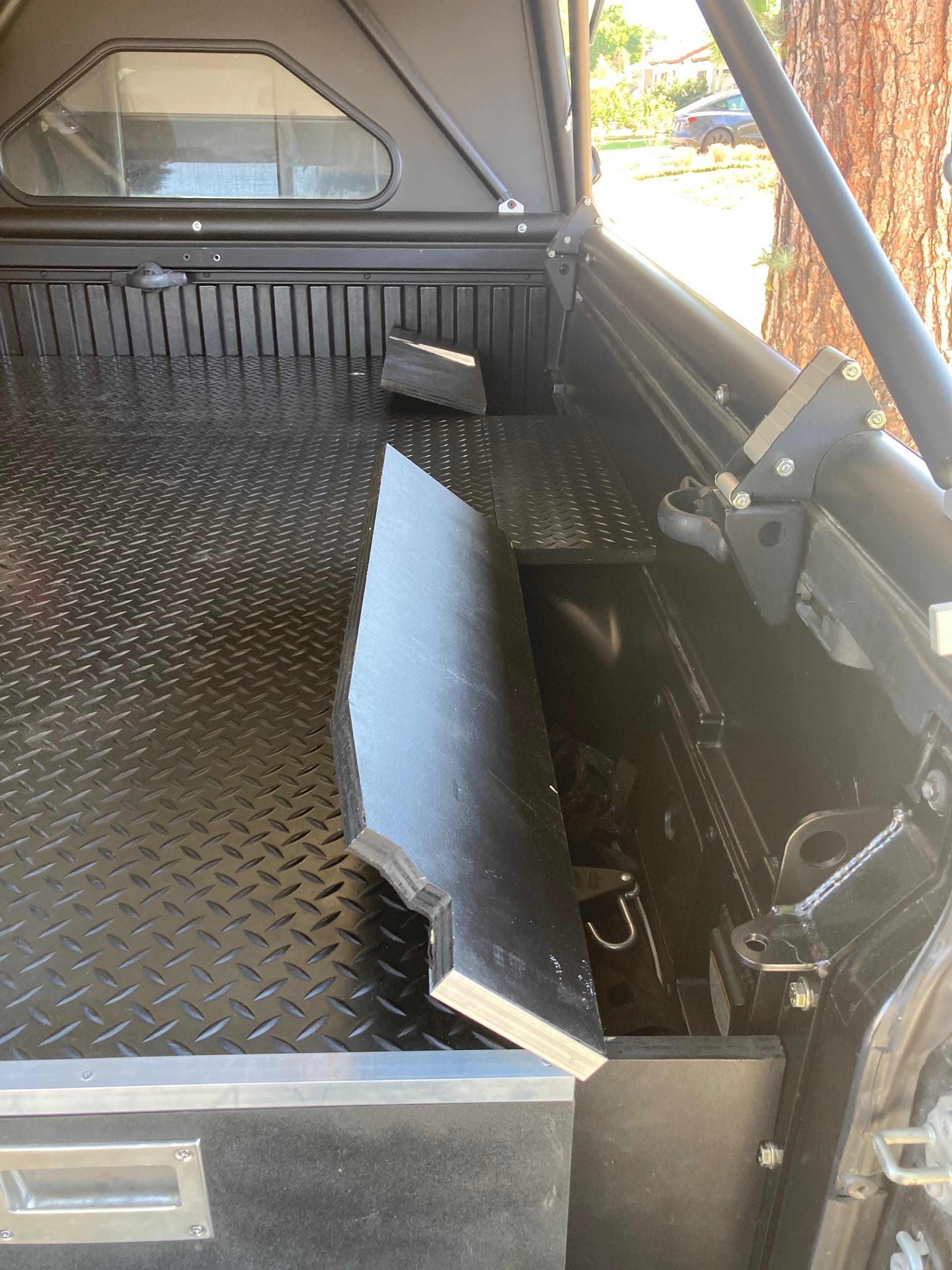 I’ve gone through a couple of different setups but have found that a platform and drawer system is the optimal use of space. This is my current set up that I built. Left drawer used for cooking/pantry/utensils & right drawer used for camp gear/tools. Cubbies in front and rear of wheel wells allow for storage as well.