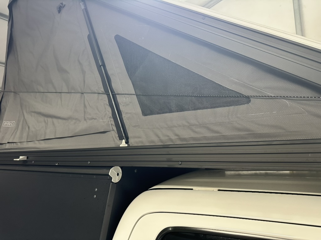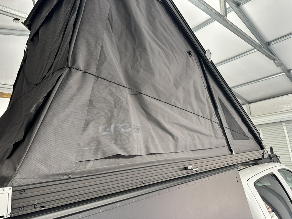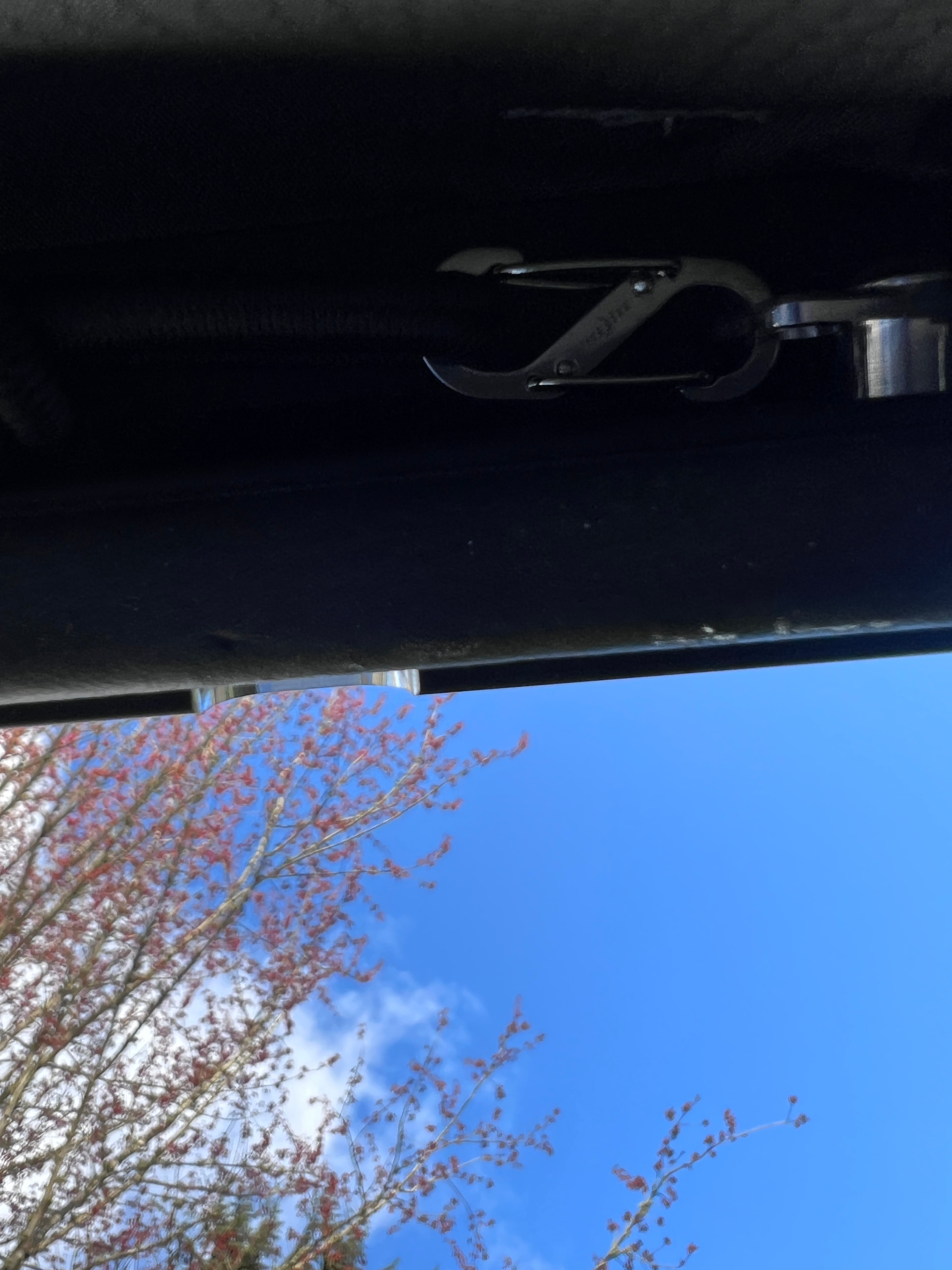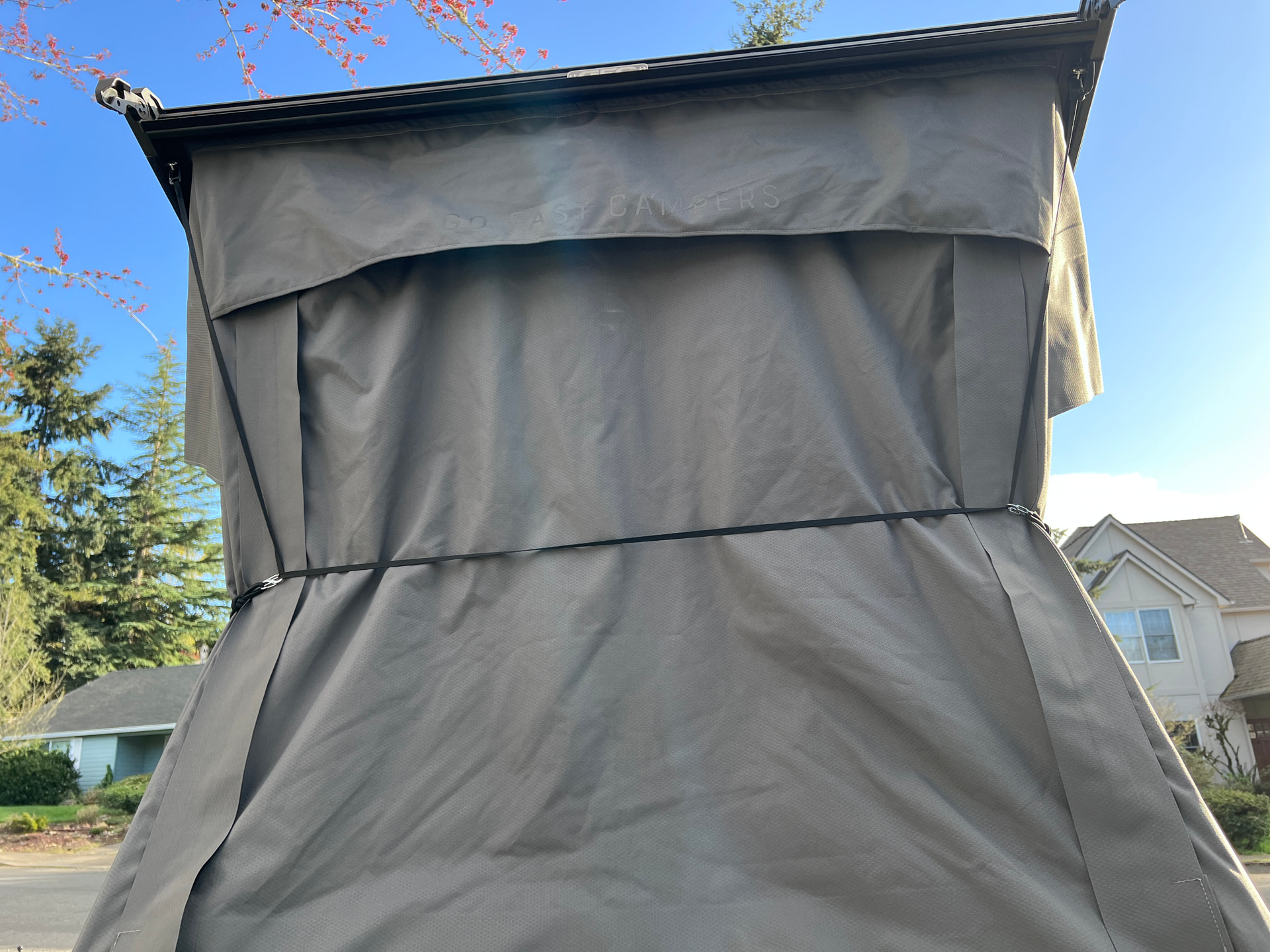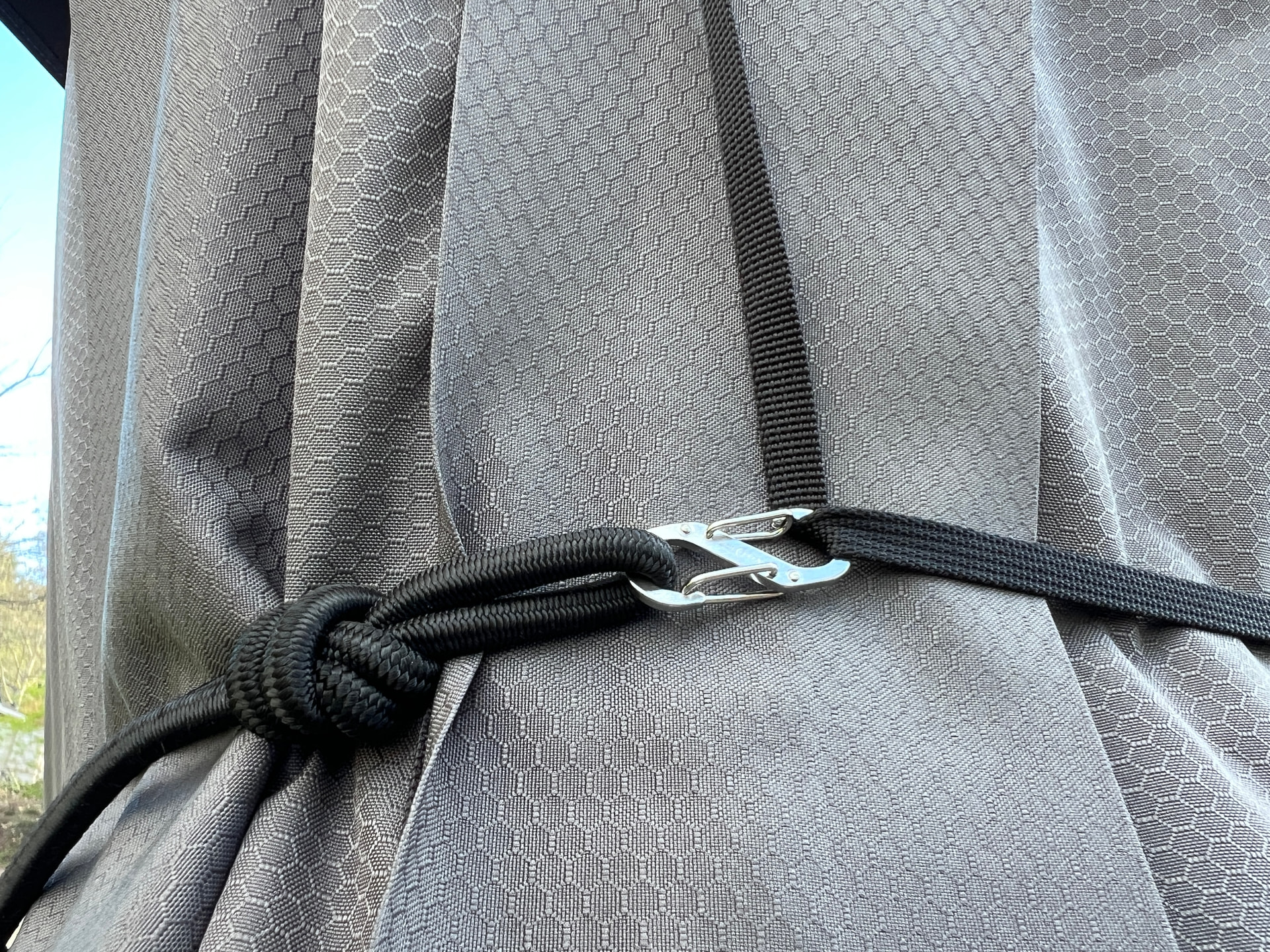 I used 1/4 bungee as I wanted a little more pull in power. I did not want a system that was too hard to remove when using the tent so as opening the flaps was not an issue. I added a loop to the bungee at each end and attached little clips to each. 4 clips, one for each end of each bungee. So one end is clipped to the billet mounts at the front of the camper and the other end clips to the tent pull strap. Then the whole unit sucks in on itself, no tucking in the tent pull either!