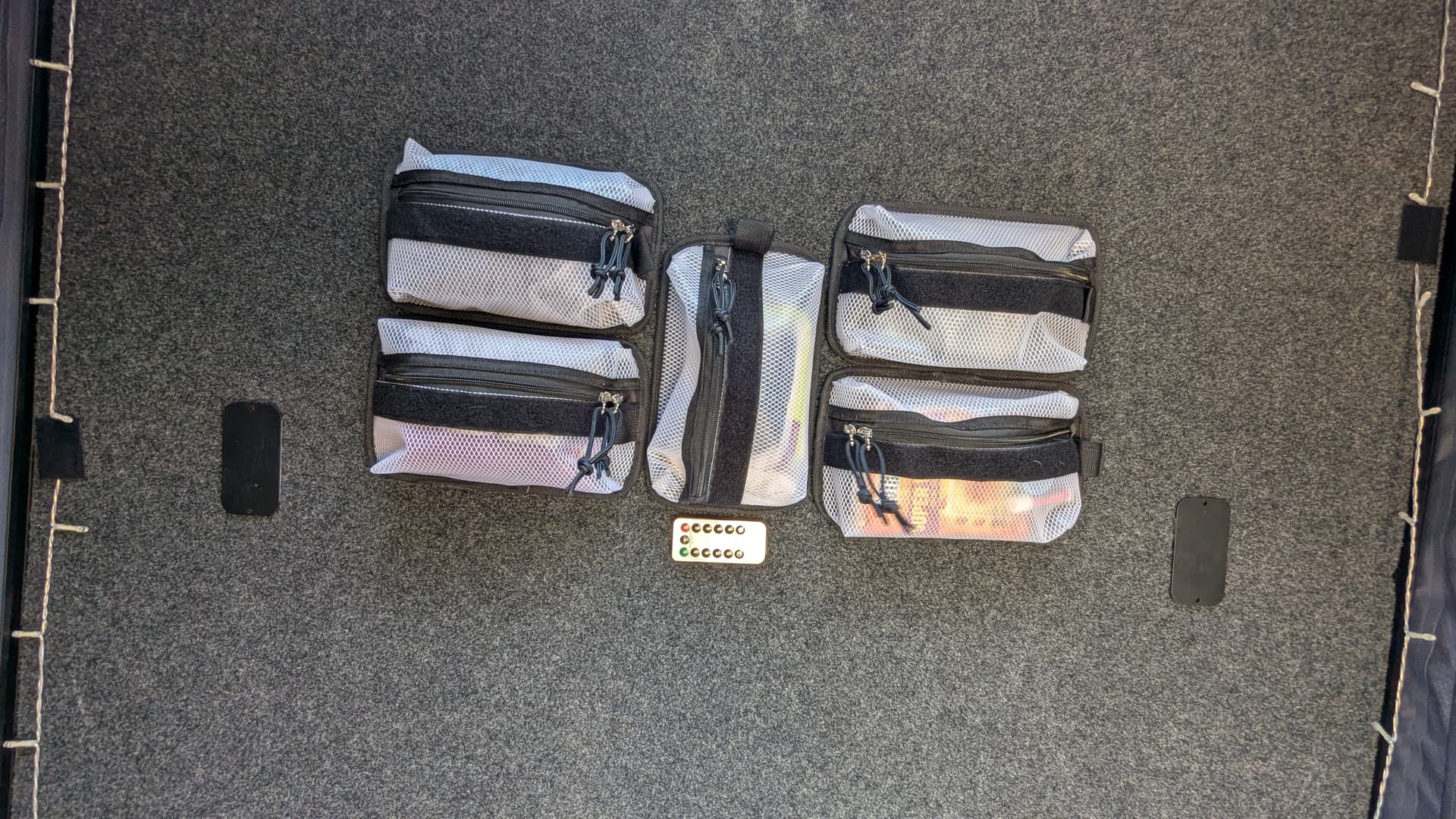 Added a couple of elasticated netting bags to the interior roof for small light things like ebooks, flashlights etc. I think they are designed for car seat backs, and attach with velcro hooks to the headliner.