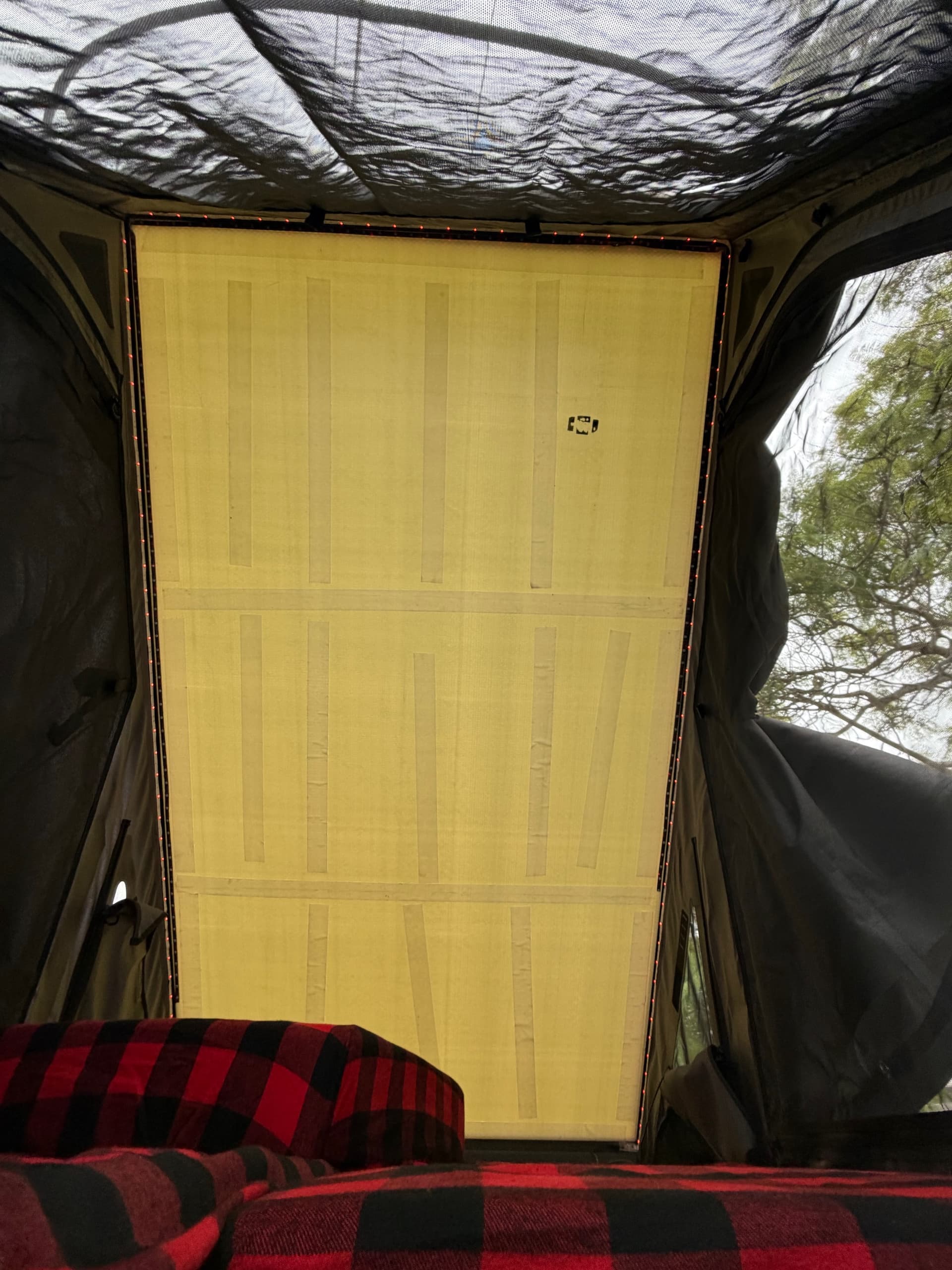 Unfortunately, there is no way in hell you can close the tent with the Pro tent, Hest mattress, and the headliner. Even with the two square mattresses turned upside down, I could not close the tent. So I have unfortunately removed the headliner. I removed most of the Velcro too (after I took the picture above). Oh well. I have a camping and hunting trip coming up so we’ll see how comfortable the Hest mattress is…